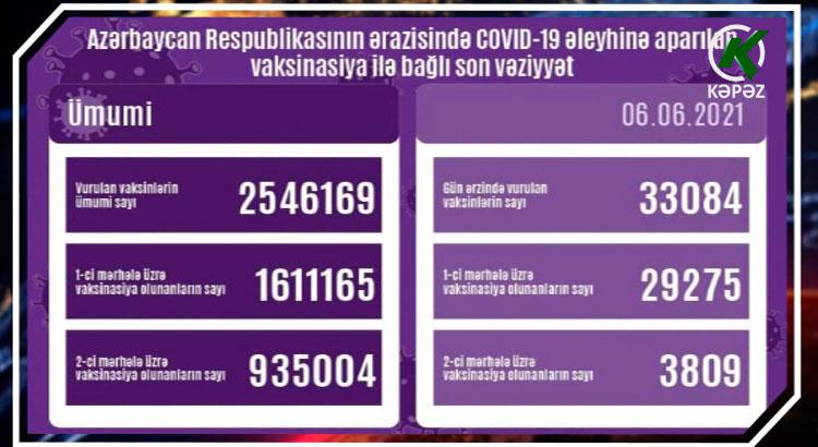 Azərbaycanda son sutkada koronavirus əleyhinə 33 084 vaksin vurulub. Bir gündə birinci mərhələ üzrə vaksinasiya olunanların sayı 29 275, ikinci mərhələ üzrə vaksinasiya olunanların sayı 3 809 nəfərdir. Ölkədə vurulan vaksinlərin ümumi sayı 2 546 169, birinci mərhələ üzrə vaksinasiya olunanların ümumi sayı 1 611 165, ikinci mərhələ üzrə vaksinasiya olunanların sayı isə 935 004 təşkil edir.
