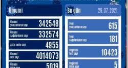 Azərbaycanda koronavirus infeksiyasına 615 yeni yoluxma faktı qeydə alınıb, 181 nəfər müalicə olunaraq sağalıb. Analiz nümunələri müsbət çıxan 5...