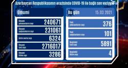Azərbaycanda koronavirus infeksiyasına 376 yeni yoluxma faktı qeydə alınıb, 101 nəfər sağalaraq evə buraxılıb. Analiz nümunələri müsbət çıxan 4 nəfər...